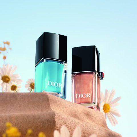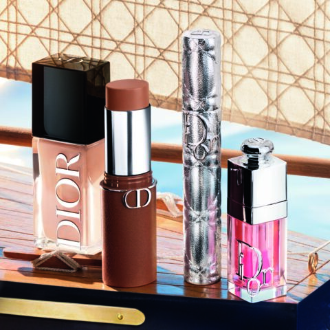 Rty a nehty ten obraz neuzavírají, spíš ho rozvádějí do detailu. Dior Addict Lip Maximizer pracuje s pěti limitovanými odstíny inspirovanými letní oblohou — od průsvitné modré Cerulean přes korálový Sunbeam a růžový Aurora až po bronzový Solar. Dior Vernis přidává dvojici laků 582 Azur a 110 Sunset, tedy modř a irizující bronz, dva základní póly celé kolekce. Tohle už není kosmetika ve smyslu izolovaných produktů. Je to drobná sezónní scénografie, promyšlená až ke konečkům prstů.
